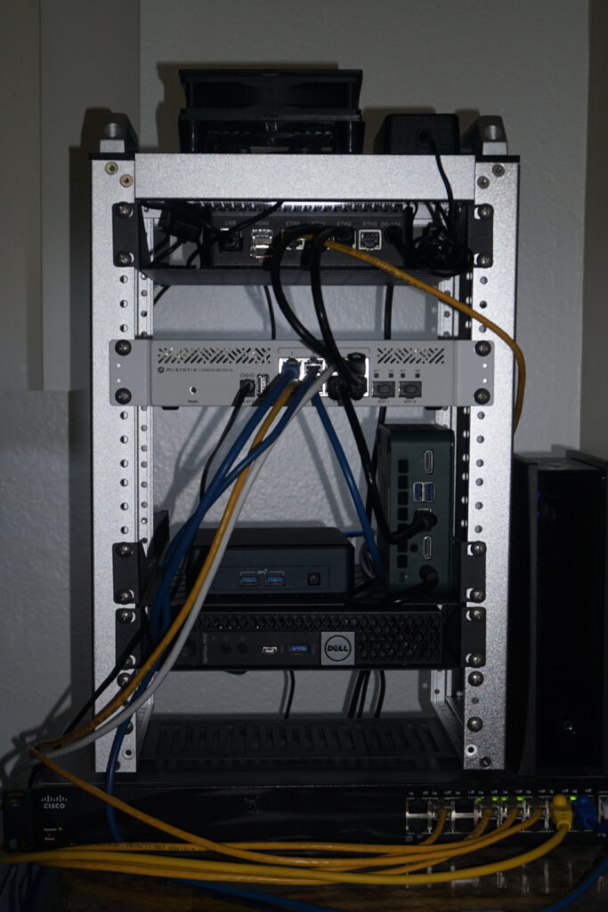 At the beginning of the year, the equipment was sitting on wire shelves inside of a closet. Now, most of the equipment is racked up inside a DeskPi RackMate T1 10-inch rack. As seen in the photo above, the 19-inch Cisco SG300-20 switch does not fit inside, so we stack the rack on top of it until I pick up a switch that fits inside of the rack.